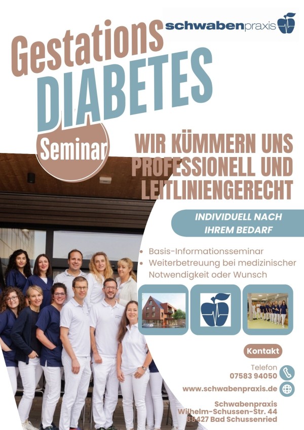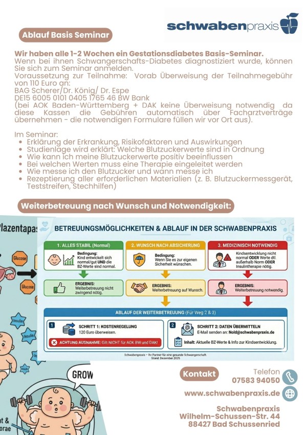 In einem einmal zu besuchenden Kurs von zwei Stunden Dauer (9:30–11:30 Uhr) vermitteln wir alle notwendigen Inhalte, damit Sie und Ihr Kind beste Voraussetzungen haben. Außer in unseren Urlaubszeiten findet bis März 2026 donnerstags (ab April freitags) von 9:30–11:30 Uhr ein Basis-Seminar statt, damit alle Frauen mit auffälligem OGTT schnell ein Angebot erhalten um in einer Kleingruppe wichtige Informationen zum Schwangerschaftsdiabetes zu erhalten. In diesem Seminar vermitteln wir alle wichtigen Inhalte zur Schwangerschaft bei Schwangerschaftsdiabetes. Falls gewünscht und benötigt, besteht bis zur Geburt eine Weiterbetreuung. Eine Anmeldung ist erforderlich. Bei der AOK Baden-Württemberg und der DAK werden die Kosten direkt mit der Kasse abgerechnet. Andere Kassen ermöglichen eine Teilnahme nur bei vorheriger Überweisung der Rechnung (idealerweise vor Ort den Zahlungsbeleg vorzeigen). Notfalls ist Barzahlung vor Ort möglich. Eine Teilnahme wird bei fehlender vorheriger Bezahlung oder fehlendem Nachweis über die Überweisung verweigert.